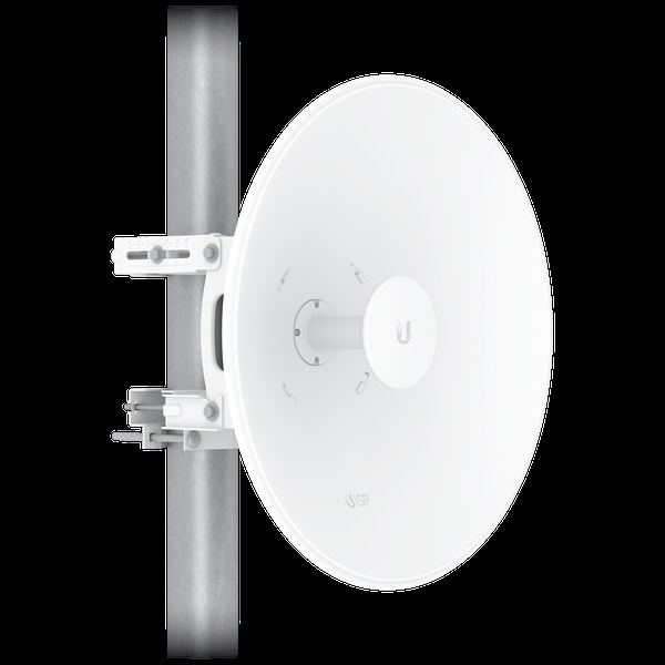 The Ubiquiti UISP Dish is a high-gain, directional antenna designed for long-range Point-to-Point (PtP) links. It operates across a wide frequency range, offering performance and reliability for WISP deployments and backhaul connections. This antenna includes a WaveGuide adapter, enabling direct and simple attachment to compatible Ubiquiti radios. It is specifically engineered to work with the airFiber 5XHD (AF 5XHD) and the airMAX Rocket Prism AC 5 GHz (RP 5AC) models, amplifying their signal for extended reach. For secure installation, the UISP Dish features a convenient mounting system with latches on each side. This design allows for a firm, snap-in connection of the radio, ensuring stability and a dependable link.